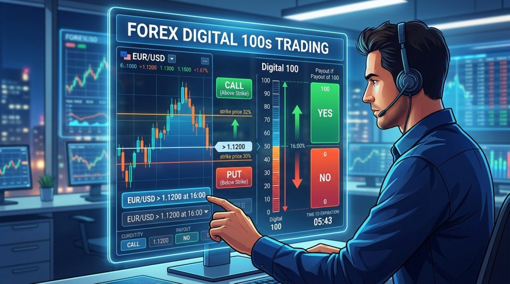 Forex based Digital 100s are fixed payout derivatives linked to a currency pair outcome at a set expiry. The structure is usually framed as a yes or no market statement. Examples include whether EUR/USD will be above a stated level at expiry, or whether a pair will touch a barrier before expiry. If the statement is true at settlement, the contract settles at 100. If false, it settles at 0 in the standard binary style version. IG describes Digital 100s as yes or no contracts priced between 0 and 100, with pricing influenced by time to expiry, the underlying market level, expected volatility, and supply and demand.